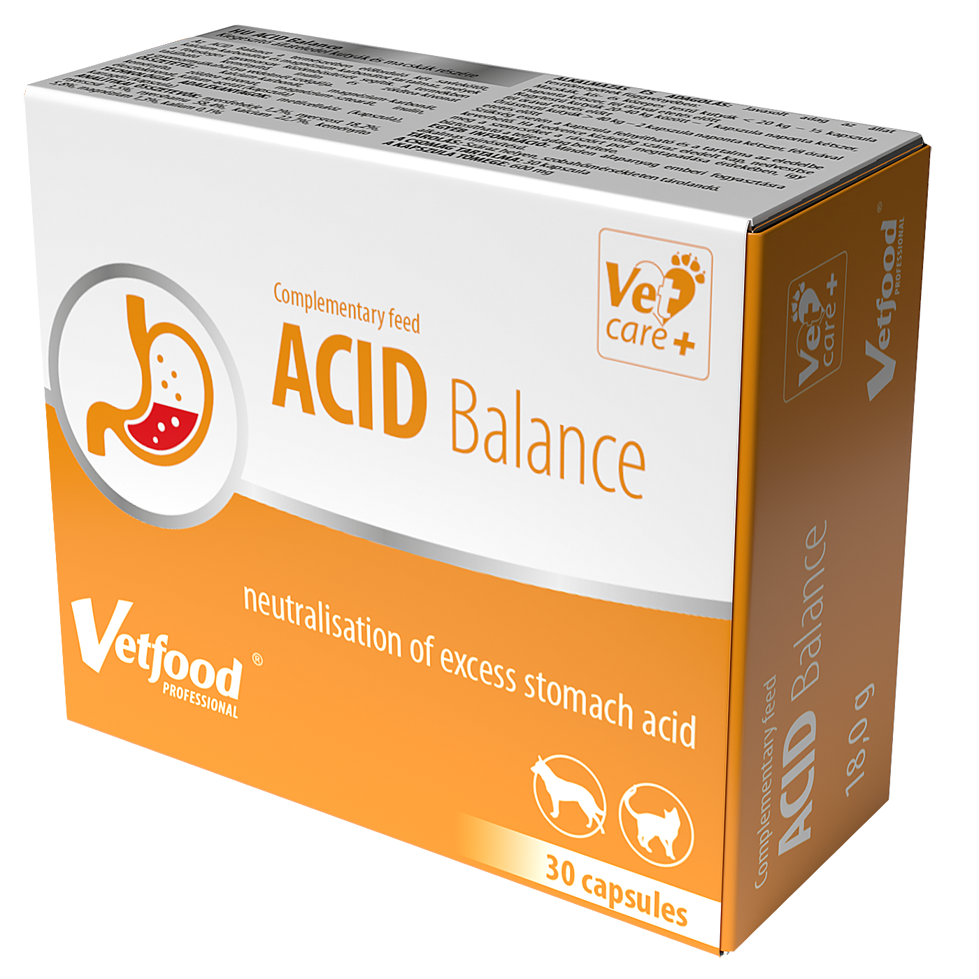 ACID Balance to produkt zawierający w składzie dwa naturalne związki zobojętniające kwas solny: węglan wapnia i węglan magnezu. Są to sole o charakterze zasadowym, które wchodząc w reakcję z HCl powodują jego przemianę w wodę i sole mineralne.Węglan wapnia ma szybkie i silne działanie zobojętniające, węglan magnezu natomiast nasila działanie węglanu wapnia. Obie sole wspomagają ochronę błony śluzowej przełyku, żołądka i dwunastnicy przed uszkadzającym działaniem soku żołądkowego. Powszechnie stosowane są u osobników, u których obserwuje się zwiększoną zawartość kwasu solnego w soku żołądkowym, którym towarzyszą objawy niepożądane oraz zaburzenia w funkcjonowaniu układu pokarmowego.Pozostałe składniki produktu: skrobia i inulina wykazują działanie wspomagające osłonę błony śluzowej żołądka, a ekstrakt z zielonej herbaty (naturalny antyoskydant) wspomaga redukcje szkodliwego działania wolnych rodników.Skład: węglan wapnia, węglan magnezu, skrobia, ekstrakt z zielonej herbaty, stearynian magnezu, inulina, ekstraktz drożdży, octan potasu (otoczkaDodatki sensoryczne: metyloceluloza (otoczka), karagen (otoczka)Skłądniki analityczne: białko surowe 1,2%, włókno surowe 18,2%, tłuszcz surowy 3,5%, popiół surowy 58,4%, wapń 22,7%, skrobia 5,8%, magnez 1,3%, potas 0,1%STOSOWANIE: Zaleca się podawać następujące ilości produktu na 30 minut przed posiłkiem w zależności od masy ciała zwierzęcia:Koty oraz małe i średnie psy do 20 kg m.c.: - ½ kapsułki x 2 dziennie Duże psy 20-40 kg m.c.: - 1 kapsułka x 2 dziennie Olbrzymie psy >40 kg m.c.: - 2 kapsułki x 2 dziennie W razie potrzeby można otworzyć kapsułkę i wymieszać jej zawartość z ulubionym przysmakiem. Jeśli sposób żywienia oparty jest tylko na suchej karmie, należy lekko zwilżyć karmę, tak żeby zawartość kapsułki przylegała do żywności i została spożyta przez zwierzę.