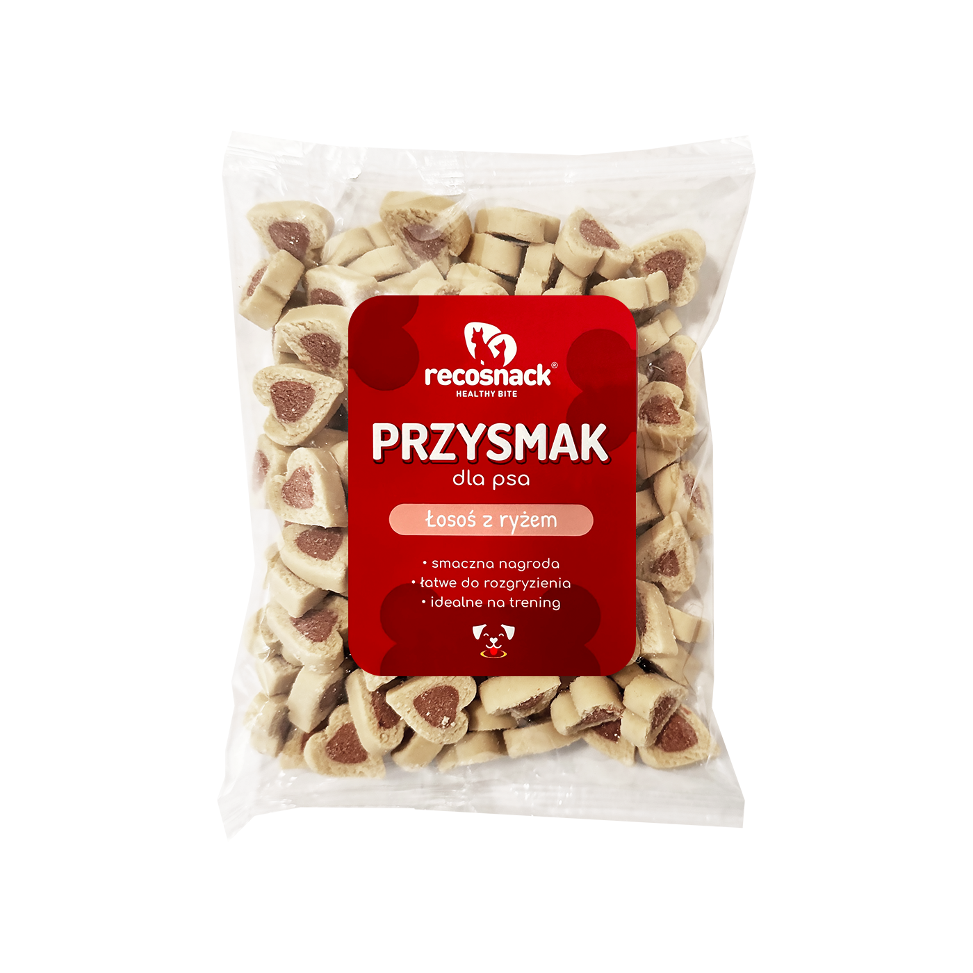 Pyszne, mięsne, aromatyczne snacki. Bardzo chętnie jedzone przez psy. Sprawdzą się w każdej sytuacji w której chcesz nagrodzić swojego pupila. Niezastąpione podczas szkolenia, pyszny dodatek do karmy czy domowej diety. RECOSNACK mogą być również wspaniałym urozmaiceniem codziennych spacerów czy wspólnej zabawy, a także formą nagrody w trakcie nauki.Pokarm uzupełniający dla psów. Pół-wilgotne smakołyki, miękkie, łatwe do rozgryzienia, niezawodne podczas treningu oraz nagradzania zwierzęcia.Analiza: Białko: 20%, Zawartość tłuszczu: 6%, Popiół surowy: 3%, Włókno surowe: 3%, Wilgotność: 18%Skład: Zboża (4% ryż), produkty uboczne pochodzenia roślinnego, mięso i produkty pochodzenia zwierzęcego 25% (w tym 5% łososia), oleje i tłuszcze, konserwanty i barwniki, dodatki sensoryczne.