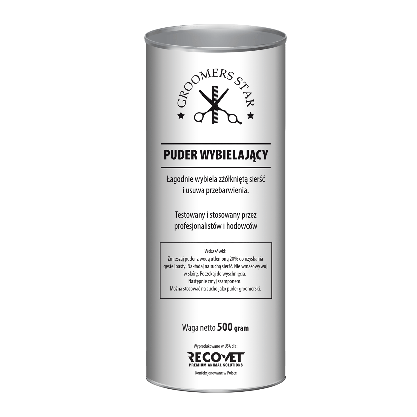 Linia groomerska stworzona w trosce o dbałość białej sierści zwierząt. Pudry są znane od lat ze swych właściwości wybielających. Umożliwiają oczyszczenie sierści na sucho bez użycia wody. Mogą być stosowane na wszelkiego rodzaju przebarwienia jak również do oczyszczenia sierści na całym ciele zwierzęcia. Produkt wykonany w ojczyźnie dbałości o wspaniały wygląd, w USA, według tradycyjnej amerykańskiej formuły. W pełni bezpieczny, nietoksyczny.Nie powoduje łamliwości włosa, matowienia, nie pozostawia żadnych śladów na sierści.Idealnie odświeża i maskuje zażółcenia.Wskazówki:Zmieszaj proszek z utleniaczem typu 20 (6%, dostępnym w większości sklepów z kosmetykami do włosów) do uzyskania gęstej pasty.Nakładaj na suchą sierść. Nie wmasowuj w skórę. Poczekaj do wyschnięcia.Następnie zmyj szamponem. Nałóż spray groomerski zapobiegający zabrudzeniom.Chroń oczy. Pamiętaj, że woda utleniona może być szkodliwa również dla skóry, dlatego nie wcieraj. Traktuj sierść powierzchniowo. Można stosować na sucho jako puder groomerski.Dostępne opakowania: 0,5 kg, 1,5 kgUwagi, przeciwwskazania i środki ostrożności:Produkt przeznaczony wyłącznie dla zwierząt. Podczas korzystania zwierzę musi być stale nadzorowane. Przed użyciem usuń wszystkie elementy opakowania.Producent / Podmiot odpowiedzialny:Recovet sp. z o.o., sp. k.ul. Srebrzyńska 5/795-050 Konstantynów Łódzkibok@recovet.pl