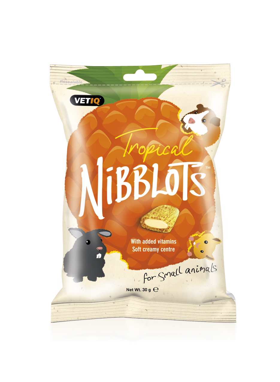 korzystny dla skóry i sierściprawdziwe owoceNibblots przysmaki stworzone w celu wsparcia dobrego stanu zdrowia zwierząt. Każdy przysmak to chrupiąca otoczka wraz z kremowym, owocowym wypełnieniem. Zawiera omega 3 i witaminy dla zdrowej skóry i sierści. Sposób użycia: Zaleca się podawać następujące ilości przysmaków:chomiki i myszy- 1 przysmak dziennieszczury domowe 1-2 przysmaki dziennieświnki morskie i myszoskoczki 3 przysmaki dzienniekróliki 5 przysmaków dziennieSkład: zboża, oleje i tłuszcze (kwasy tłuszczowe omega-3 1,2% i kwasy tłuszczowe omega-6 3,2%), pochodne pochodzenia roślinnego, owoce (4% ananas), minerały. Dodatki na kg: naturalne przeciwutleniacze, naturalne aromaty. Dodatki odżywcze: witamina E (RRR alfa tokoferol) 112 mg, witamina A 1080 IU, witamina D3 150 IU.Kochamy, troszczymy się, dzielimy się Twoją pasją do zwierząt ♥